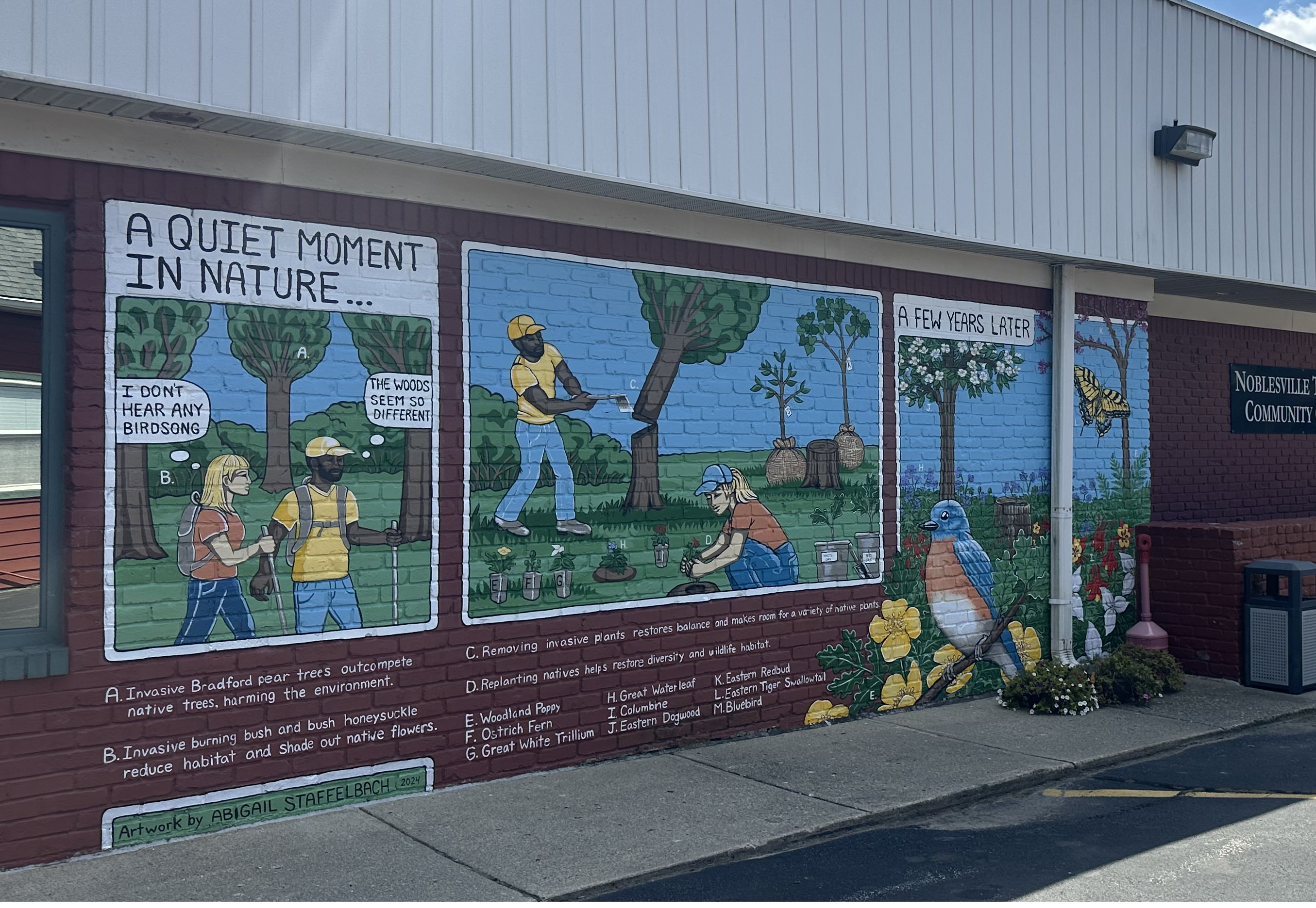NOBLESVILLE, IN – The Noblesville Township Trustees building has become the canvas for two stunning murals, blending art and conservation in a celebration of Indiana’s natural heritage. These murals, painted by local artist Abigail Staffelbach, highlight the importance of native plants and the impact of invasive species on our environment. The murals were created via a partnership between the Hamilton County Soil and Water Conservation District (SWCD) and the Noblesville Township Trustee, Theresa Caldwell. The murals were made possible through the support of Hamilton County Tourism Inc.