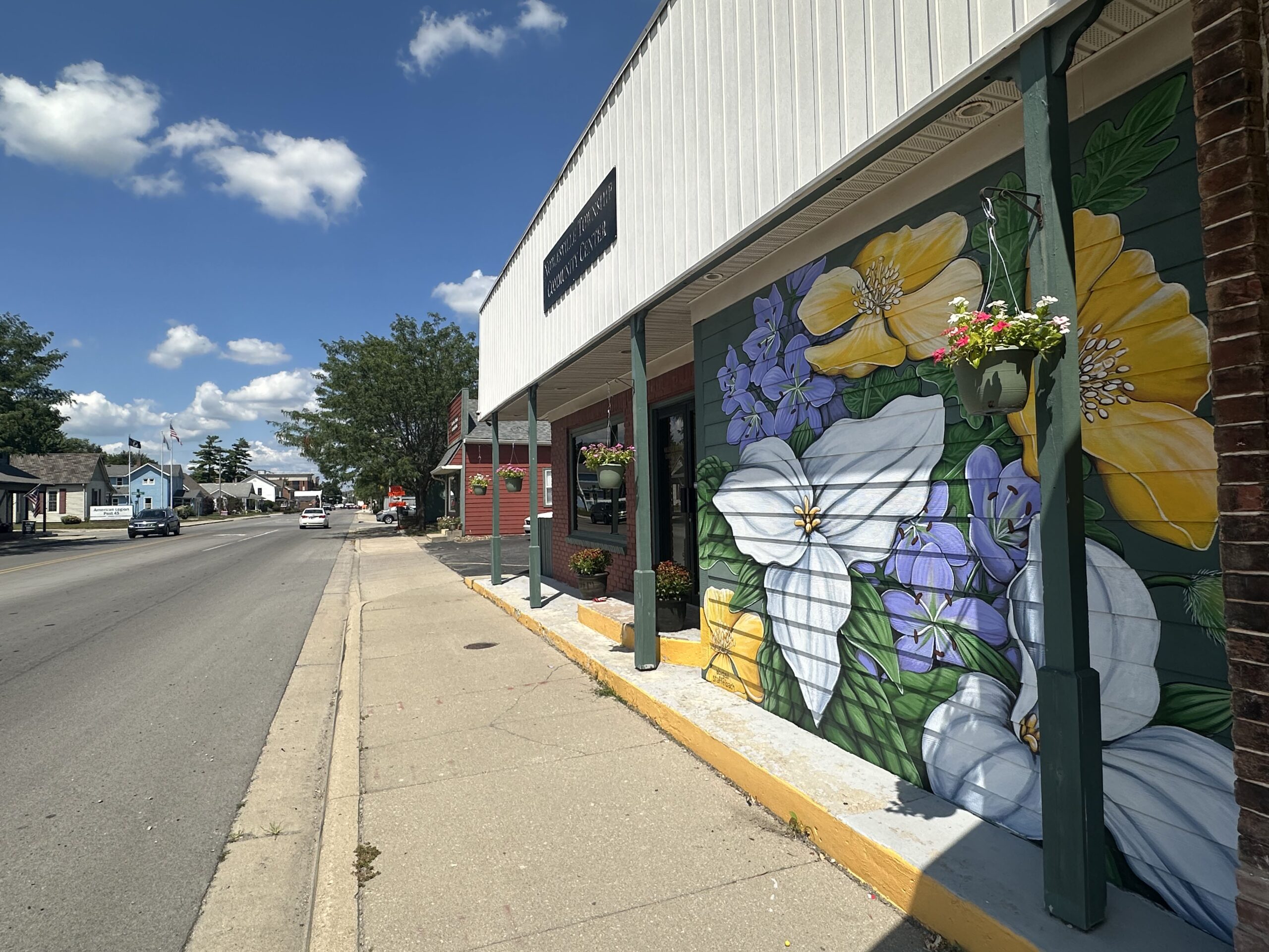 The first mural invites viewers into Indiana’s lush woodlands, where the Great White Trillium, Great Waterleaf, and Celandine Poppy (Wood Poppy) are brought to life with vibrant colors and intricate details. These native plants, vital to the health of our local ecosystems, are now immortalized on the walls of the Noblesville Township Trustees building. This mural serves as both a tribute to the beauty of our native flora and a reminder of the importance of preserving our natural landscapes.